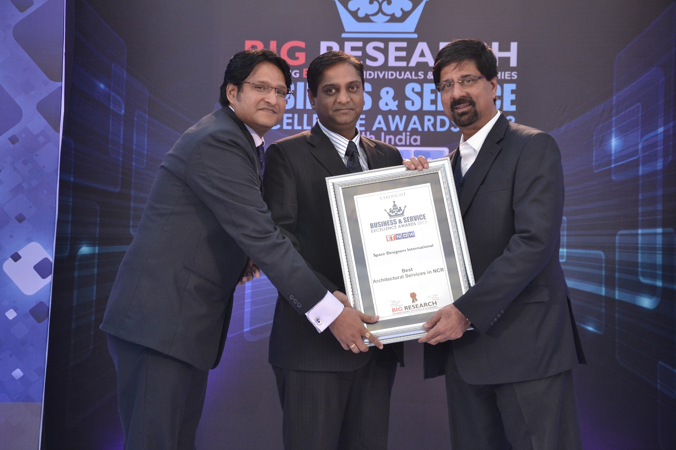 The Award for "Best Architectural Services of the Year – North India" was awarded to Space Designers International by Franchise India & Bloomberg TV in ESTATE AWARDS ceremony 2013. Dr. Vishal Mittal & Ar. Vikas Mittal receiving the award.