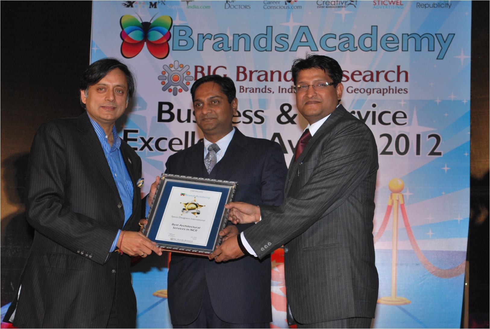 The Award for " Best Architectural Services in NCR" was awarded to Space Designers International by Big Research in BUSINESS & SERVICE EXCELLENCE AWARDS ceremony 2012. Dr. Vishal Mittal & Ar. Vikas Mittal receiving the award from renowned politician Dr. Shashi Tharoor.