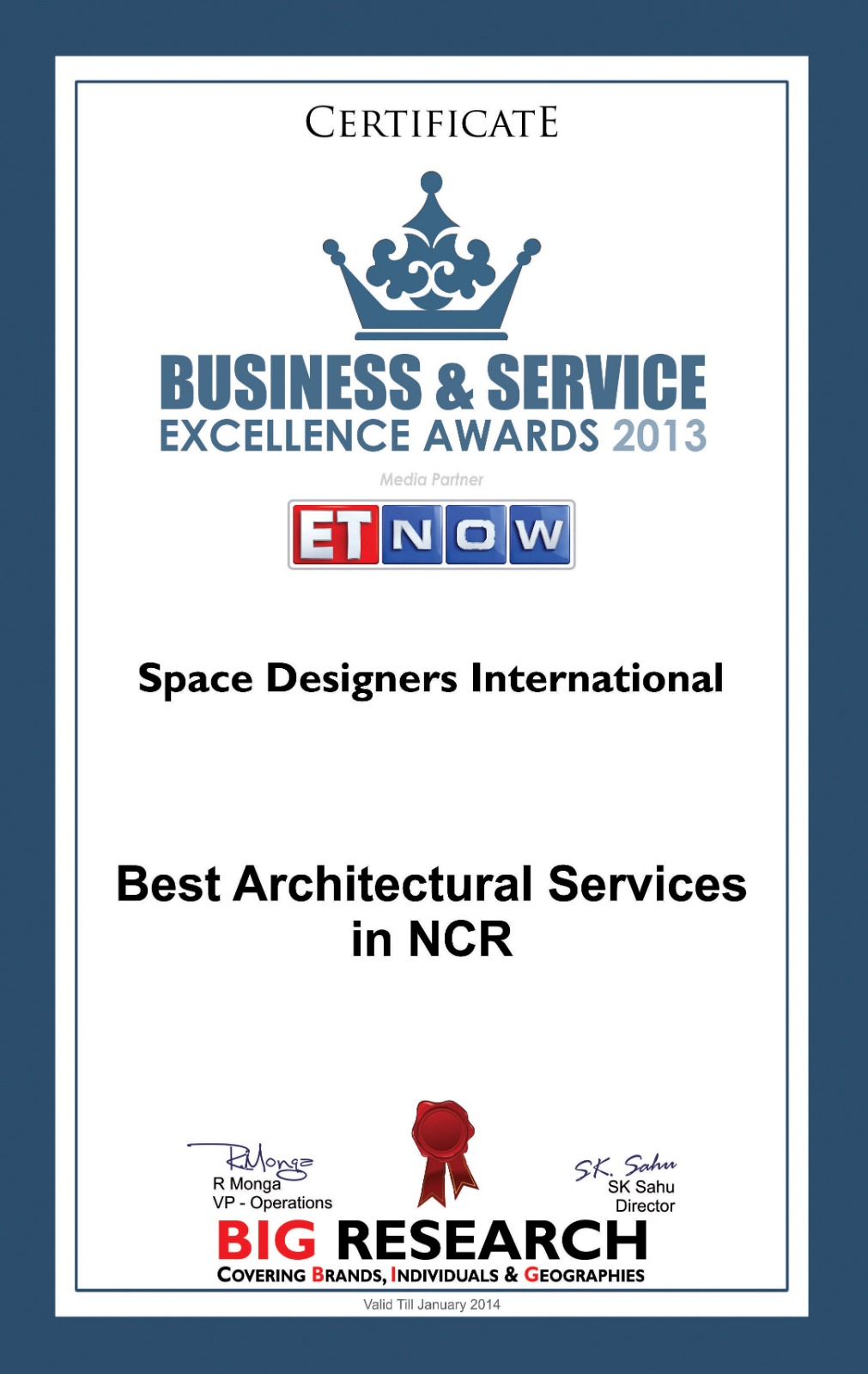 The Award for " Best Architectural Services in NCR" was awarded to Space Designers International by Big Research in BUSINESS & SERVICE EXCELLENCE AWARDS ceremony 2013. Dr. Vishal Mittal & Ar. Vikas Mittal receiving the award from renowned cricketer Mr. Krish Srikkanth.